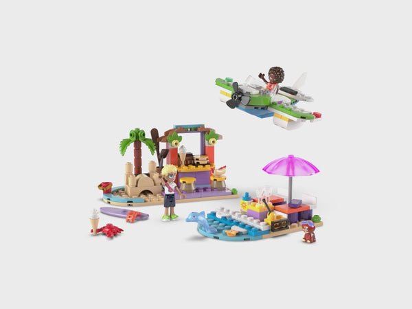 - Build, then rebuild – The set includes a beach scene with a seaplane, relaxation area and beach café hangout, which rebuilds into a new scene with a speedboat toy, an outdoor seating area and a pizza shop