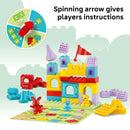 First toddlers use number and colours skills to build a creative castle toy. This fun family activity starts by each player picking a toy animal then spinning the arrow to see how many places on the board they can move. They then add to the model one brick with the colour they landed on. The game ends when all the characters arrive at the castle. In game 2, toddlers use colour sorting to see who can build the tallest toy tower. Players spin the arrow to see which colour brick they can add to their building toy.
