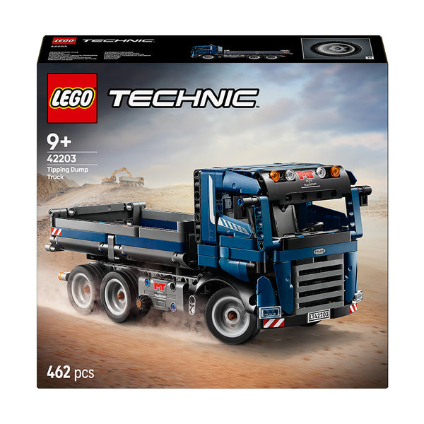 Kids aged 9 and up can create endless construction site adventures with the LEGO® Technic™ Tipping Dump Truck toy (42203). This blue construction truck toy vehicle set lets kids aged 9 and up imagine a busy working day operating their tipper truck. Steer the truck into position then turn the knob on the side of the truck to tip the lid. Open the doors to see inside the cab, then drive the truck to its next construction-site task.