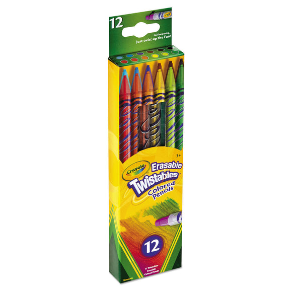 Crayola Erasable Twistables Colored Pencils put a new spin on creativity—:and the ability to erase mistakes! Just turn the ends to twist up 12 brilliant colors. There's no sharpening needed&38212;just twist and you're ready to create! The specially formulated colors are made to rub off easily with a few swipes of the built-on erasers. Great for coloring, art projects and crafts!
