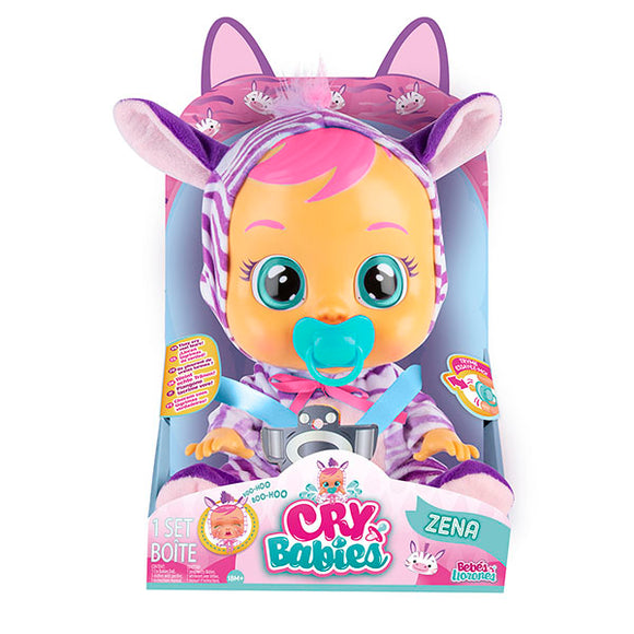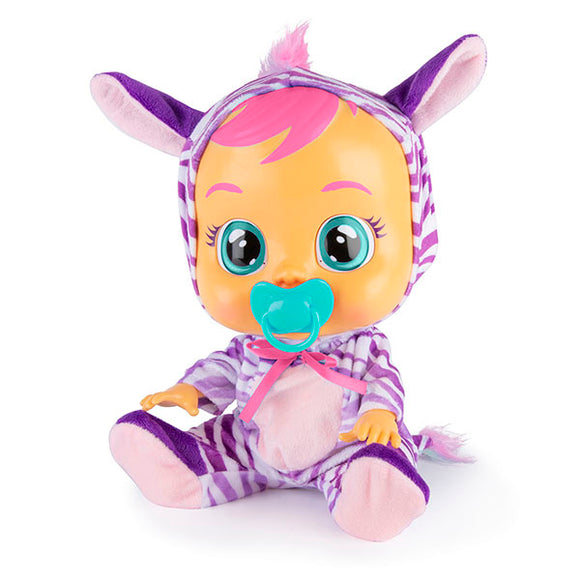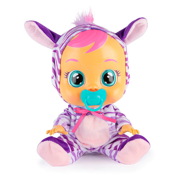 • Cry Babies Zena is, a beautiful lilac Zebra! She's so cute but ... She cries real tears when she loses the pacifier! Give her the pacifier back or rock her to stop her!