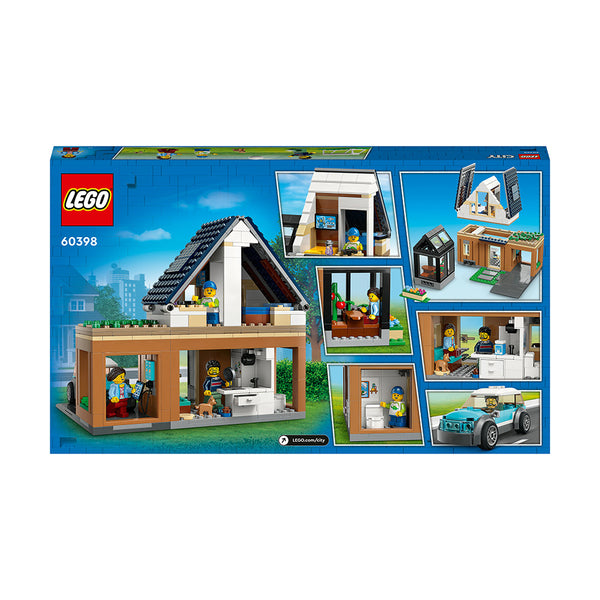 - House and car playset – The LEGO® City Family House and Electric Car (60398) toy building set features combinable room modules with lots of interior detailing for imaginative play