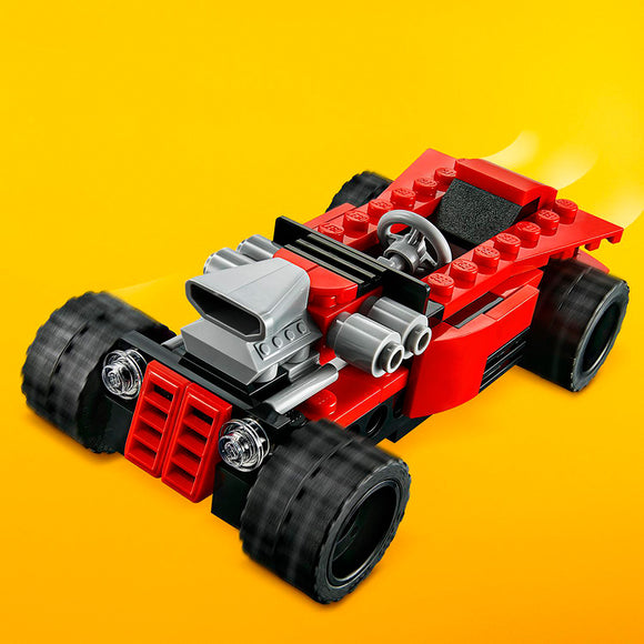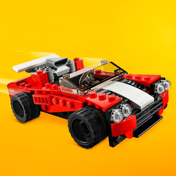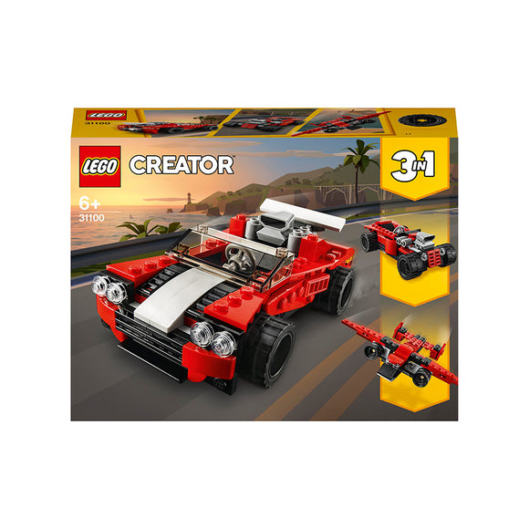 Drive kids’ love of vehicles and creativity with the exciting LEGO® Creator 3in1 Sports Car (31100) toy set. Kids will love racing around with this red and black sports car, featuring a center motor, intake pipe and a spoiler on the back. Fun and creative freedom to build Kids get 3 different build-and-play experiences with this LEGO Creator 3in1 set. They can build a sports car, rebuild it into a hot rod with motor and intake pipe, make an old-time plane, or create something completely new. This awesome building toy encourages imaginative play and makes a great treat or reward. Both the sports car and hot rod have room for a minifigure in the cab. Stand-alone models to build, play and rebuild LEGO Creator 3in1 sets offer kids fun models that are detailed and realistic and encourage imaginative play. The models create endless building and play opportunities while sparking creativity in children of all ages. These small and inspirational sets also make great any-occasion gifts.