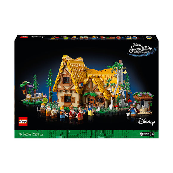 Share your passion for a classic Disney movie with this detailed LEGO® ǀ Disney Snow White and the Seven Dwarfs’ Cottage (43242) display model. The collectible building kit for adults features an opening cottage with sleeping, dining and music areas, plus a kitchen with a light brick (batteries for the light brick are included) in the hearth to add a glow. One side of the roof can also be removed for easier access, and there’s a small buildable wishing well and forest scene with a glass casket. The set includes 10 well-known Snow White and the Seven Dwarfs characters: Snow White, the Evil Queen in Disguise, the Prince, Doc, Dopey, Bashful, Grumpy, Happy, Sleepy and Sneezy, plus 6 LEGO ǀ Disney animal figures.