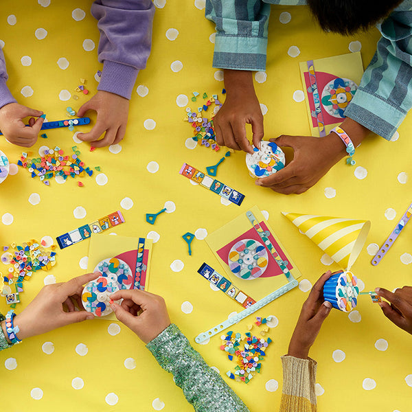 Party time! Throw the most creative party with this LEGO® DOTS set. Decorate, assemble and hang the bunting, then set up the cupcakes, bracelets and other items. There are loads of colourful tiles, stickers and flags, plus 12 charms and design ideas to throw a party full of self-expressive fun. Once the party’s over, everyone gets a cool gift!