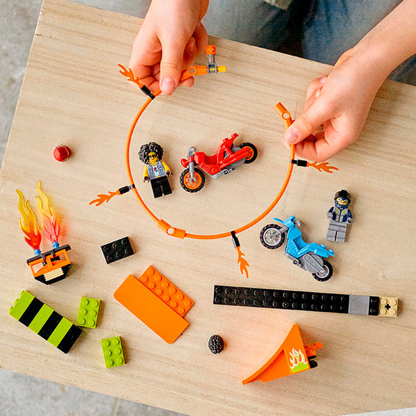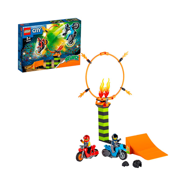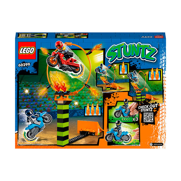 - Kids can enjoy action-packed fun with this LEGO® City Stunt Competition (60299) toy playset, featuring 2 flywheel-powered motorcycles, a stunt course and 2 riders, including a LEGO City TV character.