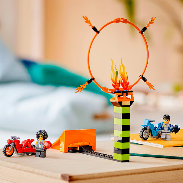 Boys and girls who like to compete will love this LEGO® City Stunt Competition (60299) toy playset, featuring 2 flywheel-powered motorcycles for performing amazing wheelies and high-flying stunts. Kids also get a reconfigurable launch ramp and a ring-of-fire stunt course. Just add the rider and LEGO City TV Duke DeTain minifigures for spectacular stunt action!