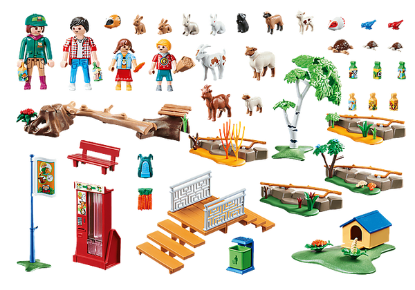 Set includes four figures, sheep, goats, guinea pigs, rabbits, rabbit hutch, logs, trees, birds, feeding machine, viewing platform, and tons of other accessories
